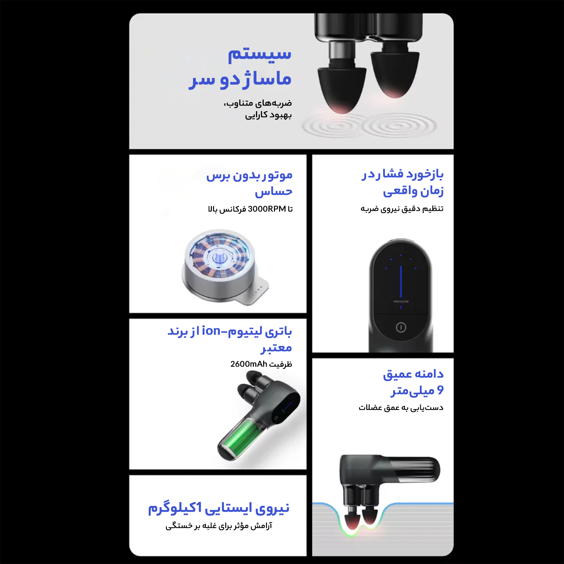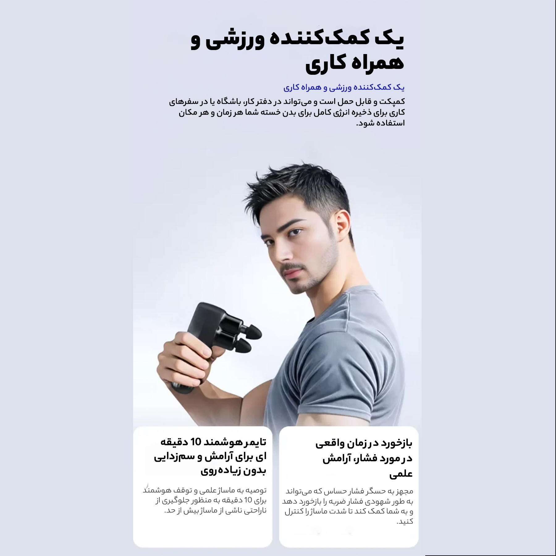 نام:ماساژور تفنگی / تفنگ ماساژ / گان ماساژ برند:Beoka مدل :F5 قابلیت استفاده:خانگی/سالن های ورزشی /فیزیوتراپی / سالنهای ماساژ جنس و مواد ساخت:آلیاژ آلومینیوم PP ABS مواد سر ماساژور: PP EVA /ABS دامنه نوسان:9mm تعداد سرعت:5سرعت قابل تنظیم توان نامی موتور:25W نوع باتری:باتری لیتیوم ظرفیت باتری:قابل شارژ2600mAh تعداد سری ماساژ:4جفت(8عدد) زمان شارژ: 3 ساعت زمان کار:نسبت به استفاده متغیر است(1 تا2 ساعت) خاموشی خودکار :پس از 20 ثانیه در حالت آماده به کار بدون هیچ عملیاتی سایز:174x88.4x45mm شارژ کردن ماساژور تفنگی دوسر Beoka مدل F5 قبل از اولین استفاده، دستگاه را تقریباً 3 ساعت به طور کامل شارژ کنید. برای شارژ کردن محصول، آن را با کابل USB-A به USB-C که همراه محصول ارائه شده است، به منبع تغذیه 5V/2A وصل کنید. هنگام شارژ از طریق پریز برق، یک آداپتور برای کابل USB-A به USB-C لازم است. یک آداپتور معمولی تلفن همراه این کار را انجام می دهد. زمانی که منبع تغذیه کمتر از 5V/2A باشد، زمان شارژ بیشتر خواهد بود. هنگامی که چراغ نشانگر باتری می زند، به این معنی است که دستگاه در حال شارژ شدن است. وقتی تمام چراغ‌های نشانگر باتری متوقف می‌شوند و کاملاً روشن می‌مانند، به این معنی است که دستگاه کاملاً شارژ شده است. شما می توانید باتری را در هر زمان و در هر سطح باتری شارژ کنید. هنگام استفاده از ماساژور، چراغ نشانگر باتری زمانی که سطح باتری کمتر از 30 درصد است قرمز می شود و زمانی که سطح باتری زیر 20 درصد است به رنگ قرمز چشمک می زند که در این صورت باید سریعا آن را شارژ کنید. خالی کردن کامل باتری توصیه نمی شود. بسته به فرکانس ارتعاش و فشار اعمال شده در حین استفاده، دستگاه پس از شارژ کامل می تواند به طور متوسط ​​1 ساعت کار کند. از یک حوله مرطوب برای تمیز کردن دستگاه استفاده کنید و آن را با یک پارچه نرم خشک کنید. در صورت عدم استفاده طولانی مدت، دستگاه را در جعبه بسته نگهداری کنید. هیچ پیچی را بردارید و سعی نکنید محصول را جدا کنید. برای دستیابی سریع به بهترین ظرفیت باتری، باتری جدید را سه بار یا بیشتر کاملاً شارژ و خالی کنید. هنگامی که برای مدت طولانی بدون استفاده رها می شود، باتری باید یک بار در ماه شارژ شود. از مصرف الکل، رقیق کننده، بنزن و سایر حلال ها خودداری کنید. اینها می توانند منجر به خرابی، شکستگی قطعات یا تغییر رنگ شوند.